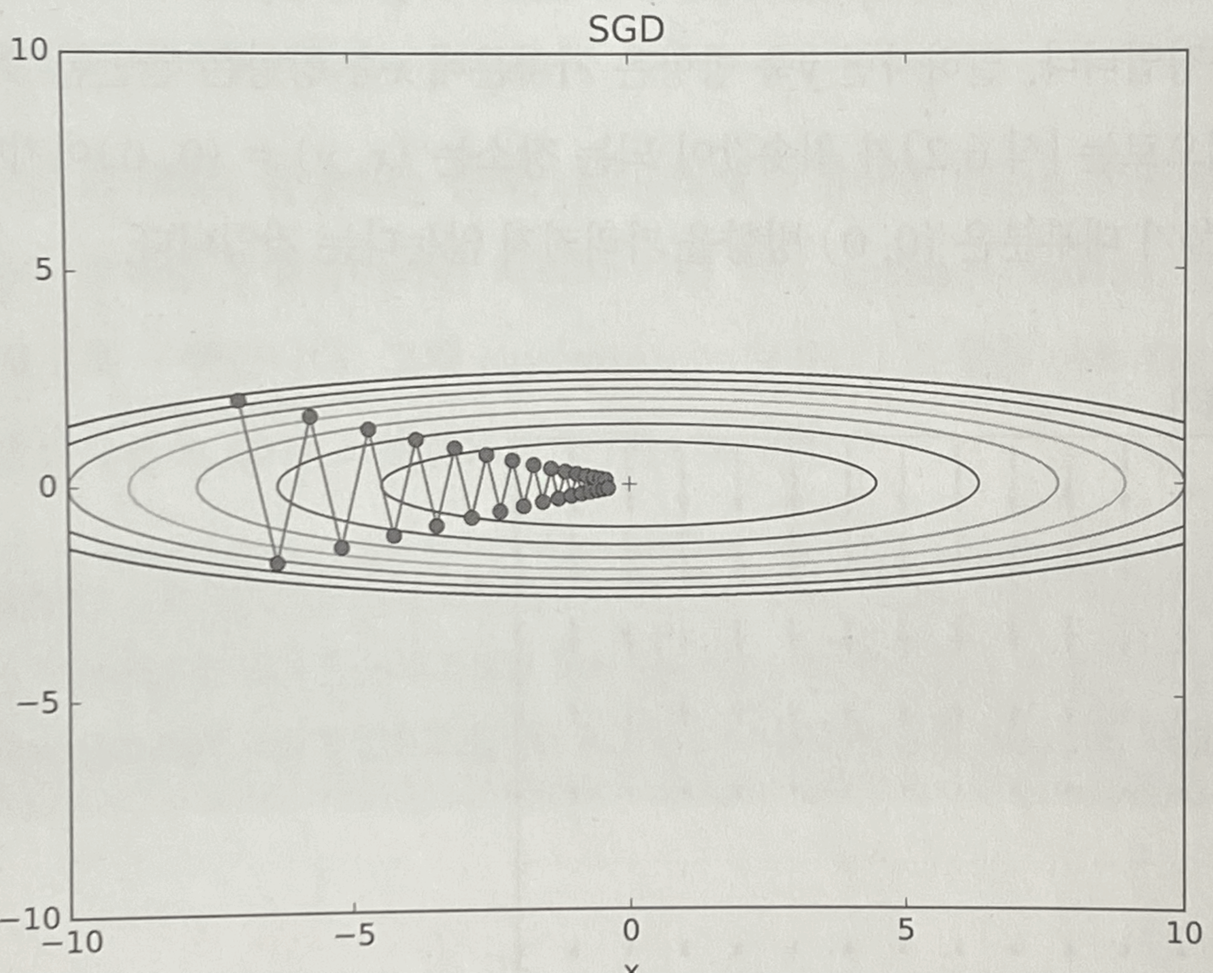- SGD는 비등방성(anisotropy)함수에서 탐색 경로가 비효율적이 되는 특징이 있다. [그림1]처럼 탐색 경로가 지그재그 모양이 된다. 이동거리가 길어지기 때문에 이동거리를 줄여서 속도를 더 빠르게 할 수 있지 않을까?라는 욕심을 내볼 수 있다. 그리고 수렴 자체도 불안정해져서 시간이 오래걸린다. 물론 GD보다는 속도면에서, 그리고 local min. 방지면에서 나아진 것은 확실하다. 더 욕심이 날 뿐..!!