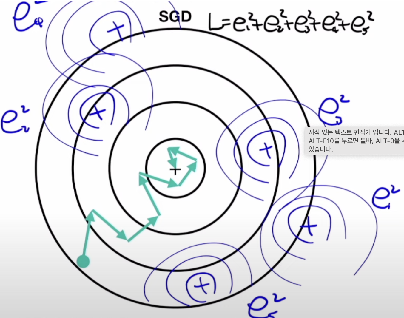 - 『밑바닥부터 시작하는 딥러닝』에서는 위에 있는 그림처럼 $f(x,y)=\frac{1}{20}x^{2}+y^{2}$라는 함수를 예시로 들고 보여주면서 근본적인 원인이 '기울어진 방향이 원래의 최솟값과 다른 방향을 가리키기 때문'이라고 하고, 혁펜하임 유튜브에서는 오른쪽 아래의 그림을 그리면서 1번 이동할 때마다 각각의 오차들의 방향을 따라서 이동한다고 하는데.. 그럼 타원에서는 왜 저렇게 예쁜 지그재그 형태로 이동하고 원에서는 저렇게 삐뚤빼뚤하게 이동하는거지..? 저 타원에서 SGD말고 GD를 적용했을 때의 이동경로는 어떻게 되는거지..? 약간 공 떨어뜨렸을 때 진동하는 것처럼 생각하면 GD를 적용하면 (-7,0)에 수렴하는 걸까.? 하지만 GPT는 (0,0)에 수렴한다고 알려주는걸.. 누가 맞는거지.