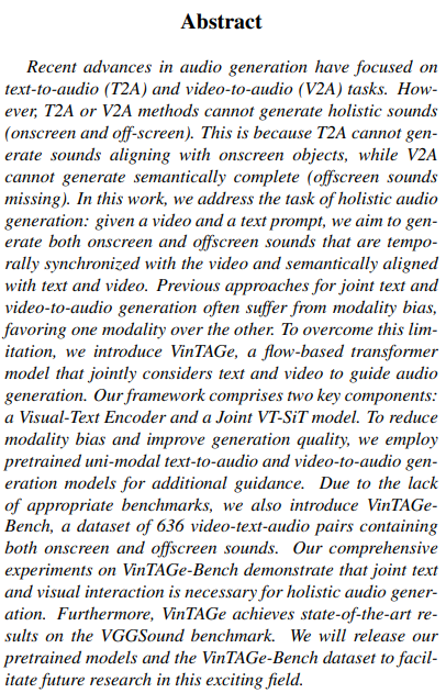 최근 오디오 생성 연구는 T2A랑 V2A 태스크를 중심으로 진행되었음. 근데 이러한 방식들은 onscreen과 offscreen을 모두 포함하는 holistic 한 소리를 생성하는 데에 한계가 있음