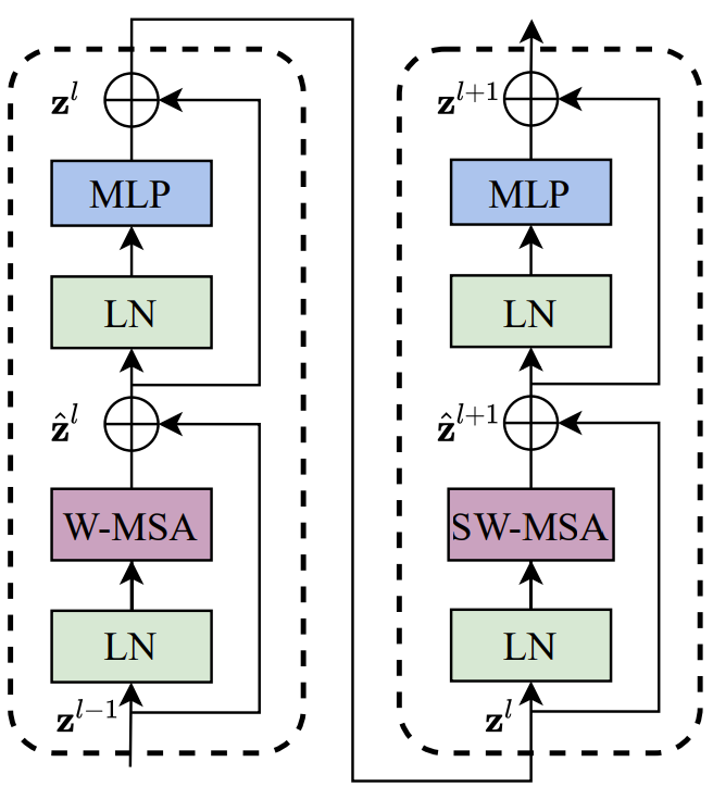 LN → W/SW-MSA → Residual → LN → MLP → Residual → ... 식으로 쓴다는 거임
