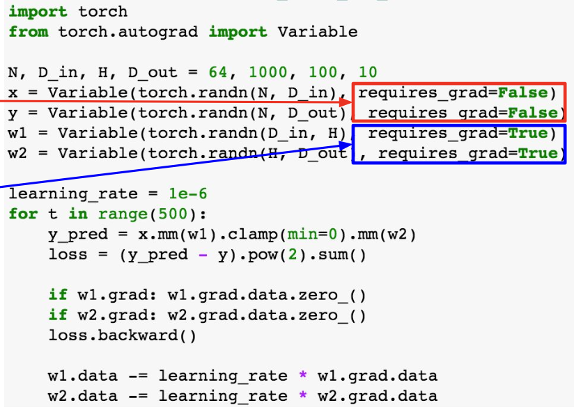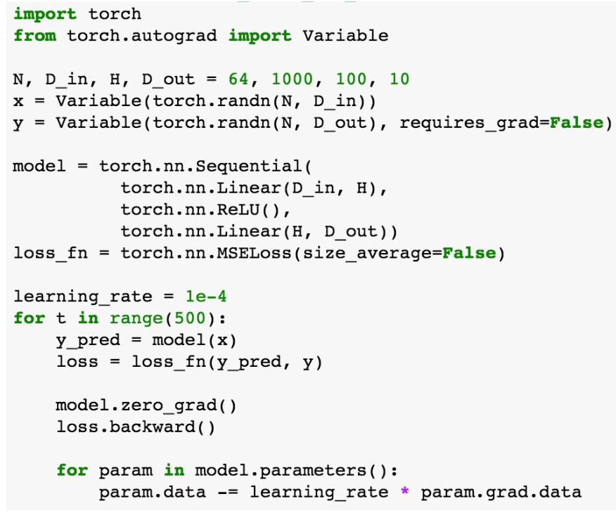 - PyTorch에서는 Variable과 a=x*y, b=a+z, c=torch.sum(b)로 구현한다.