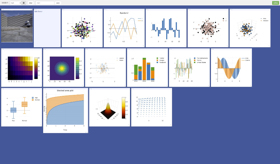 - Visdom은 TensorFlow의 TensorBoard와 비슷하게 아래 그림과 같은 시각화를 제공한다.