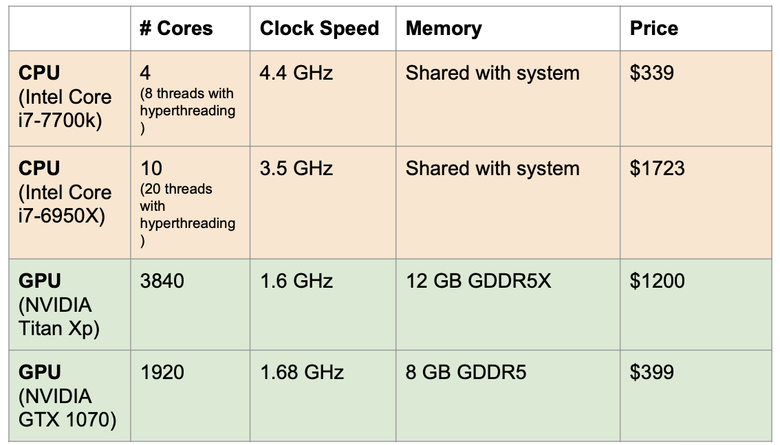 - CPU와 GPU를 표로 비교해서 나타내면 아래와 같다.