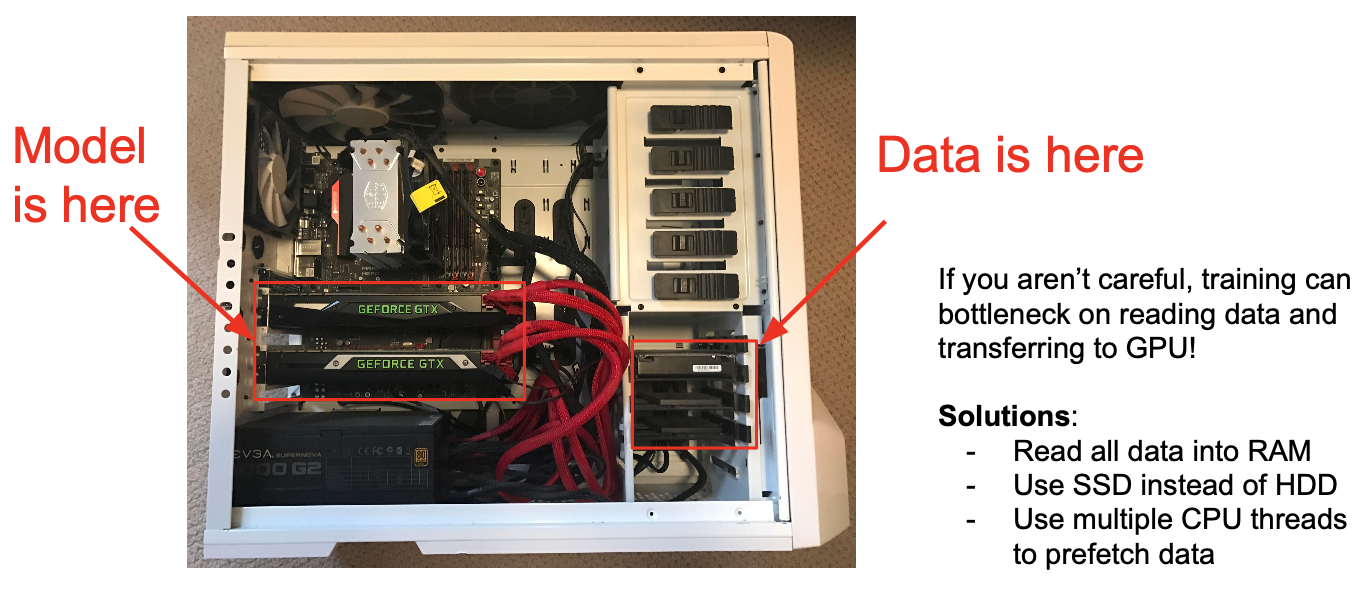 아래 사진과 같이 학습 데이터는 HDD나 SSD에 저장되어 있고, 모델은 GPU에 위치하기 때문이다.