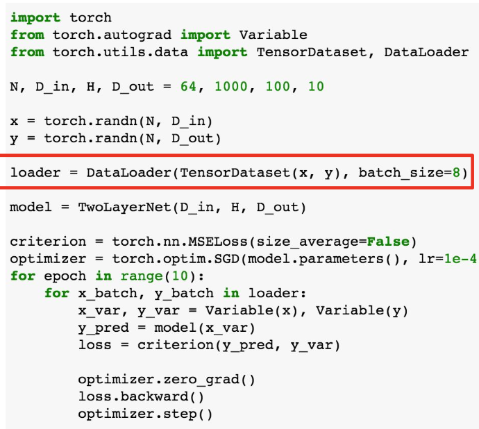 - DataLoader는 데이터를 불러오고 미니배치, 셔플링, 멀티스레딩 등을 할 수 있게 한다.