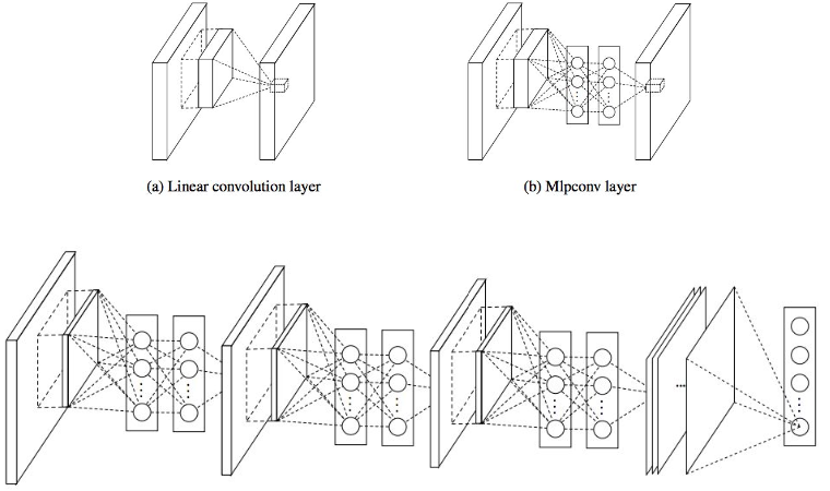 아래 구조(b)처럼 conv layer 자체가 1x1 conv layer로 구성된 mlpconv layer이다.