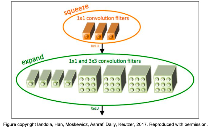 - SqueezeNet은 아래 그림과 같이 1x1필터로 squeeze하는 층과 1x1과 3x3 필터로 expand하는 층으로 구성되어 있다.