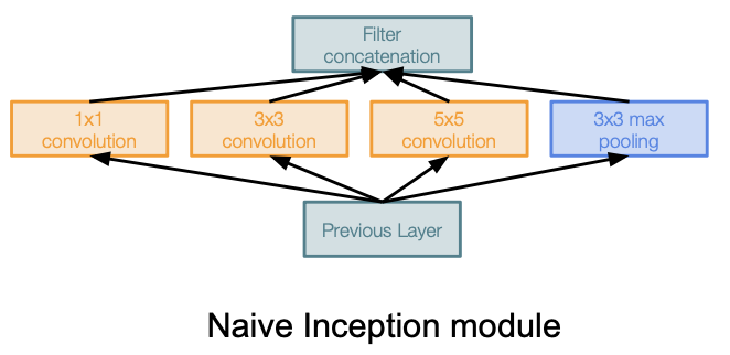 - Inception module은 다양한 크기의 필터(1x1 3x3 5x5 conv, 3x3 pooling)를 병렬적으로 사용해서 다양한 스케일의 정보를 추출한다.