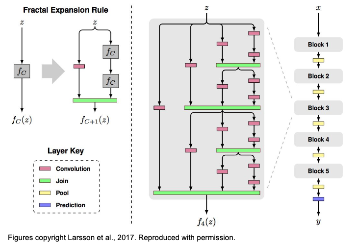 - FractalNet은 아래 그림과 같은 fractal구조(네트워크 안에서 여러 경로가 중첩된 형태)를 사용한다.