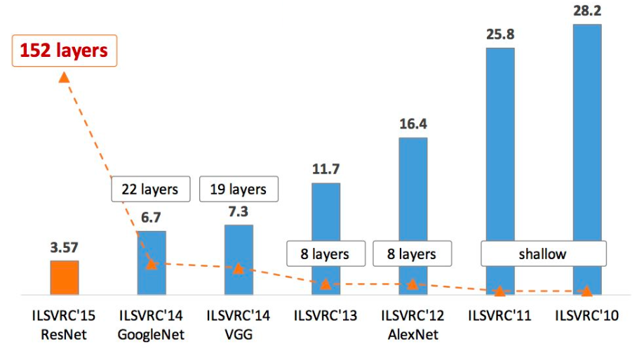 ILSVRC-2015에서 우승한 ResNet-152는 top-5 error 3.57%을 기록하면서 휴먼에러를 넘어섰다.