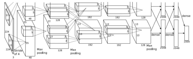 - 아래 그림과 같이 conv layer 5개와 fc layer 3개로 이루어져 있다.