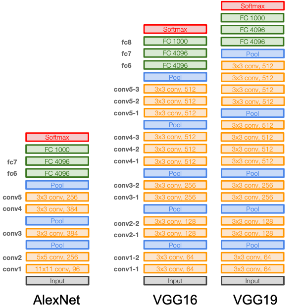 아래 그림은 AlexNet과 VGG-16, VGG-19의 구조를 보여준다.