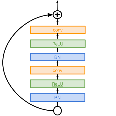 아래 그림과 같은 $y=BN(ReLU(F(x)))+x$ 구조로 수정하면서 성능을 높였다.