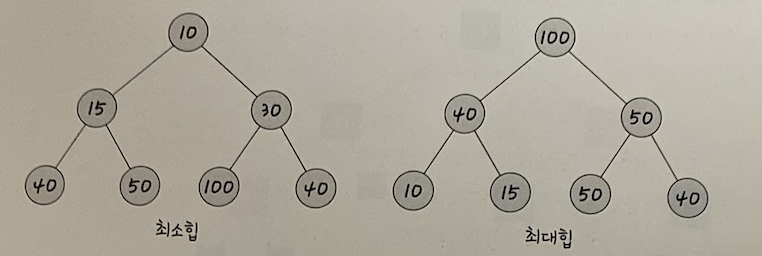 - 최소힙(Min-Heap): 루트 노드에 가장 작은 값이 위치한다.